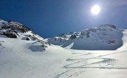 Schon wieder unser Abschlusstag. Nochmals die kurze Anfahrt nach Bernina Suot, 2.046m, und wieder startet unsere heutige Tour hinein ins Val dal Fain. Diesmal wird der Piz Minor, 3.049m, unser Tagesziel sein. Im Aufstieg durchs Val da Fain geht es zuerst wieder genüsslich bergauf. Wir verlassen später das Tal und steigen nordseitig zum Piz Minor, 3.049m auf. Im Aufstieg haben wir Zeit, um uns die beste Linie für die Abfahrt auszuwählen. Die Vorfreude steigt mit jedem Meter.