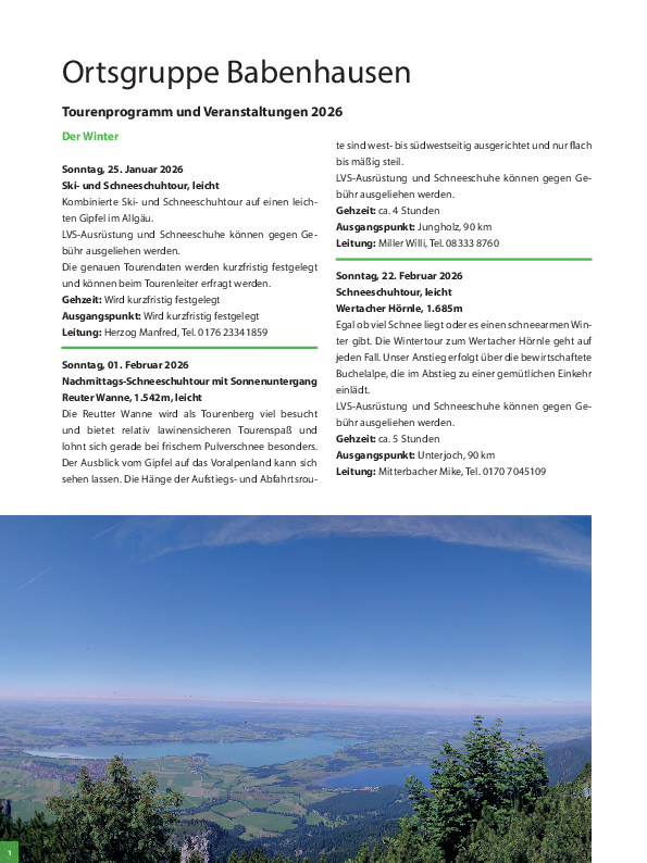 Die Anmeldungen zu den Programmen für die Ortsgruppe Babenhausen erfolgen direkt beim jeweiligen Tourenleiter. Die Teilnahme- und Anmeldebedingungen sowie Hinweise für Touren der Seniorengruppe bitte aus dem Jahresprogramm entnehmen.