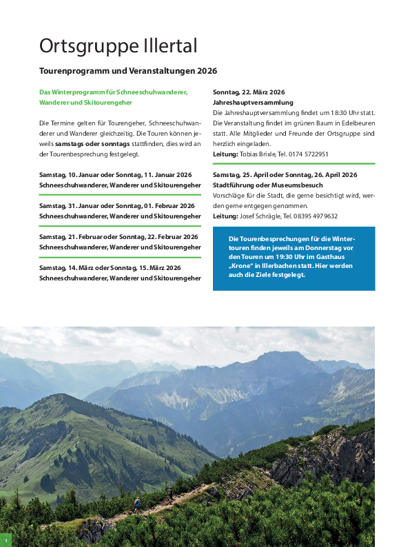 Unser jährlich neu erarbeitetes Tourenprogramm bietet Abwechslung im Sommer sowie im Winter. Familienwochenende, einfache, mittlere oder schwere Bergtouren, hier ist für jeden was dabei. Hier geht es zum Programm: Ortsgruppe Illertal Jahresprogramm 2026